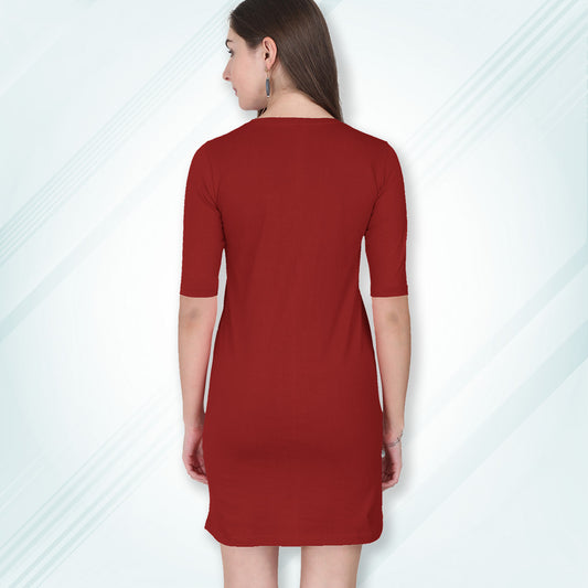 Red Long T-Shirt Dress | Knee Length 3/4 Quarter Sleeves Cotton Tops with Side Pockets | Women