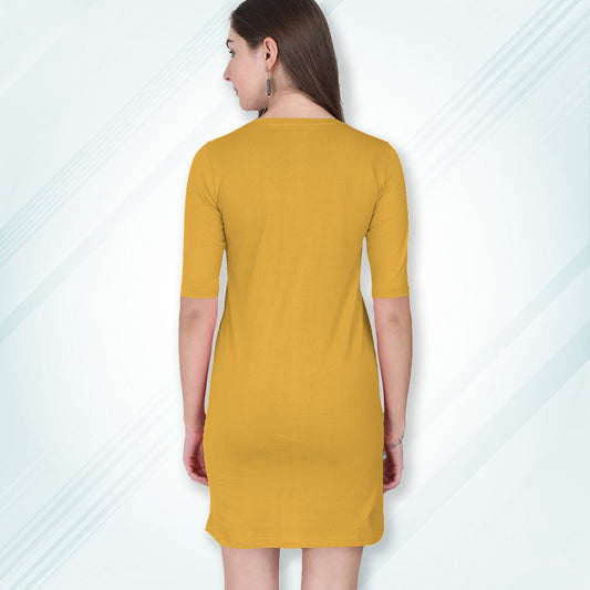 Golden Yellow Long T-Shirt Dress | Knee Length 3/4 Quarter Sleeves Cotton Tops with Side Pockets | Women