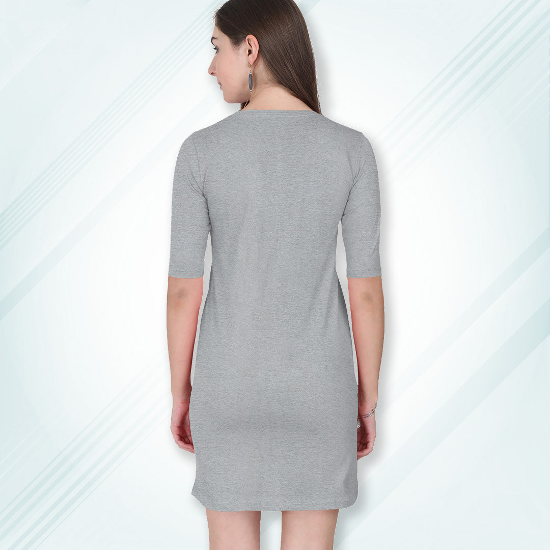 Grey Melange Long T-Shirt Dress | Knee Length 3/4 Quarter Sleeves Cotton Tops with Side Pockets | Women