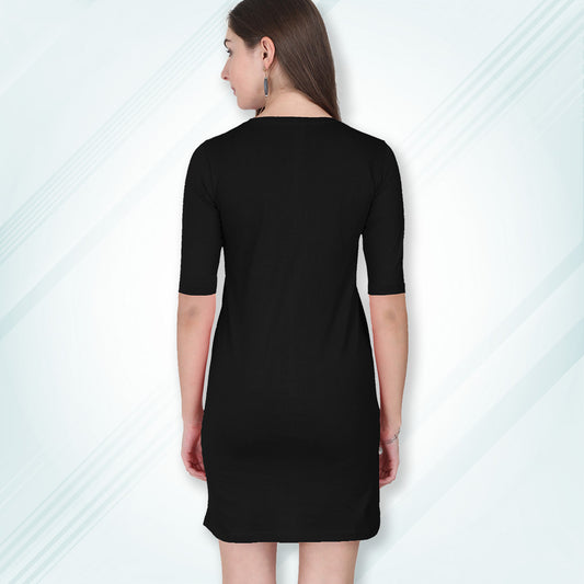 Black Long T-Shirt Dress | Knee Length 3/4 Quarter Sleeves Cotton Tops with Side Pockets | Women
