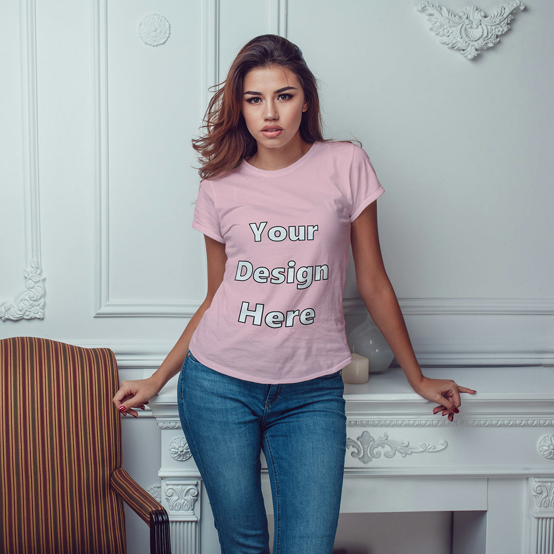 Light Pink Round Neck Classic Customized T-Shirt Front Design | Women