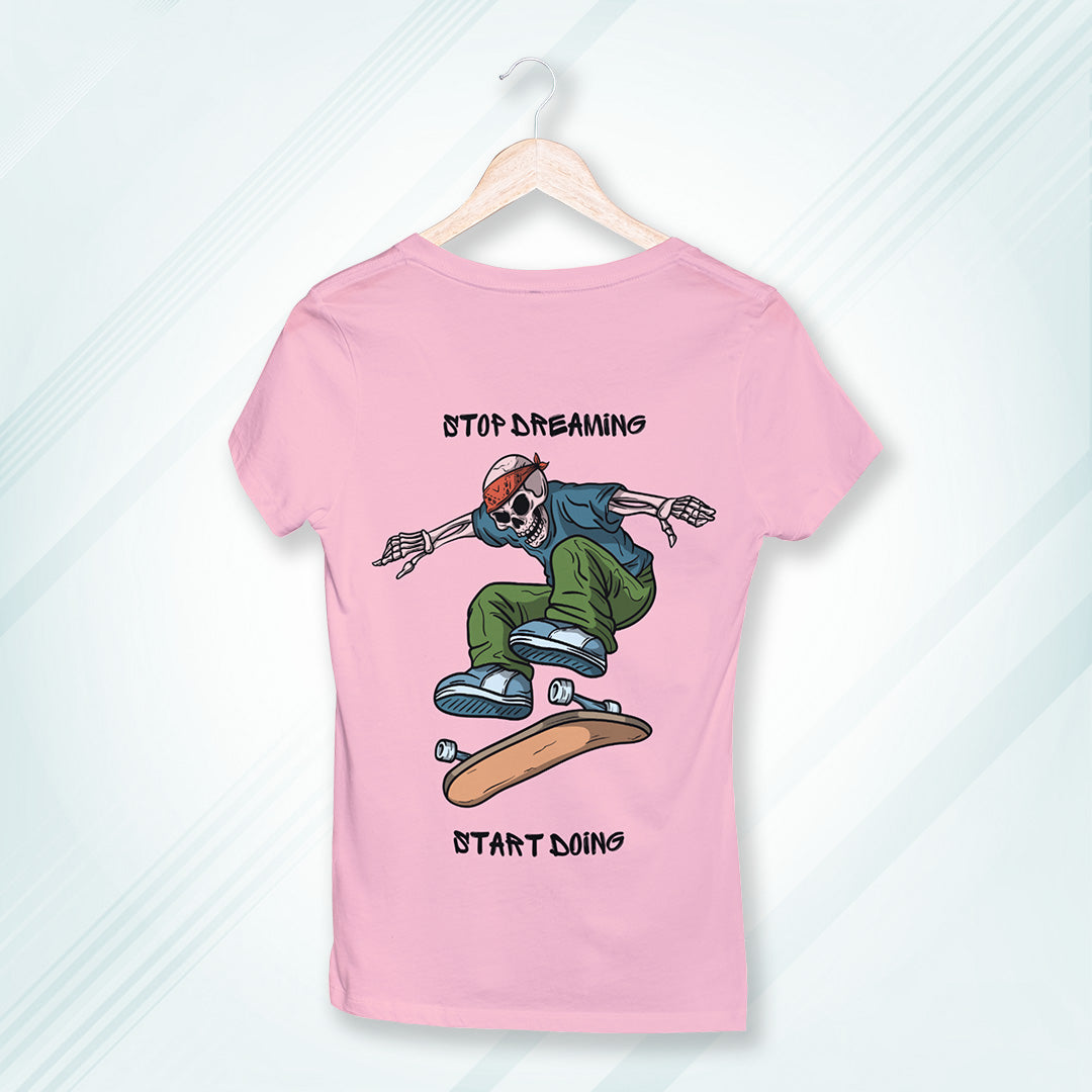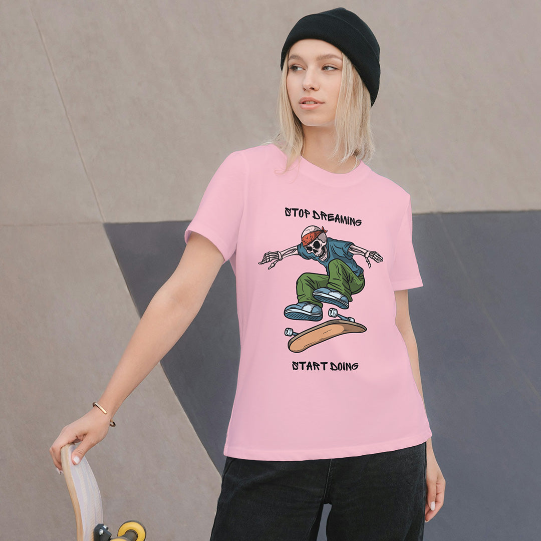 Pink Round Neck Classic Printed Classic T-Shirt Stop Dreaming Start Doing Skate | Women