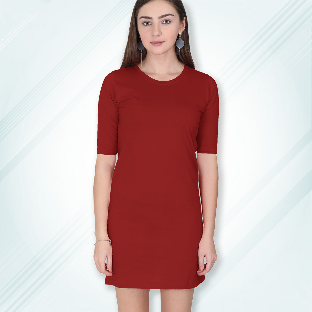 Red Long T-Shirt Dress | Knee Length 3/4 Quarter Sleeves Cotton Tops with Side Pockets | Women