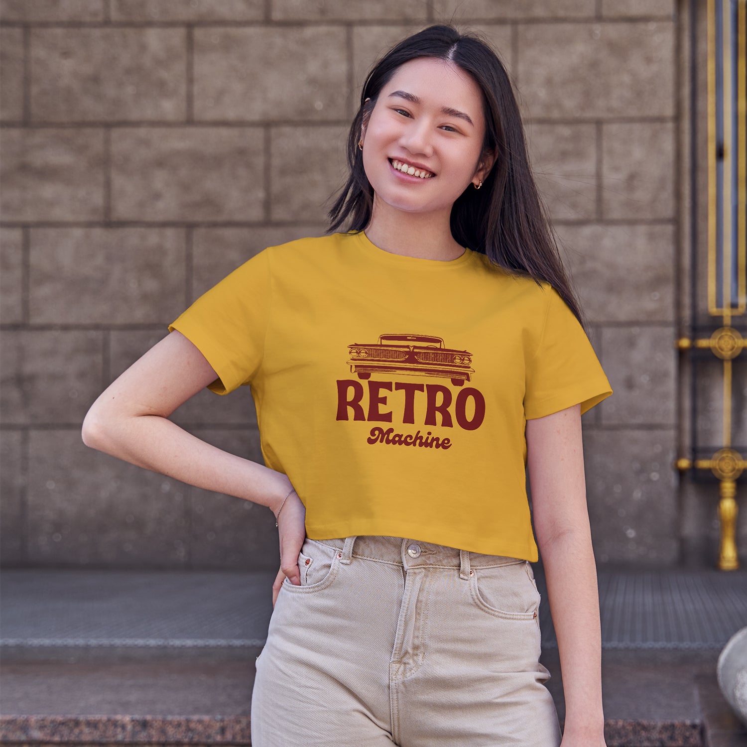 Retro Machine Car Cotton Round Neck Half Sleeve Crop Top | Women