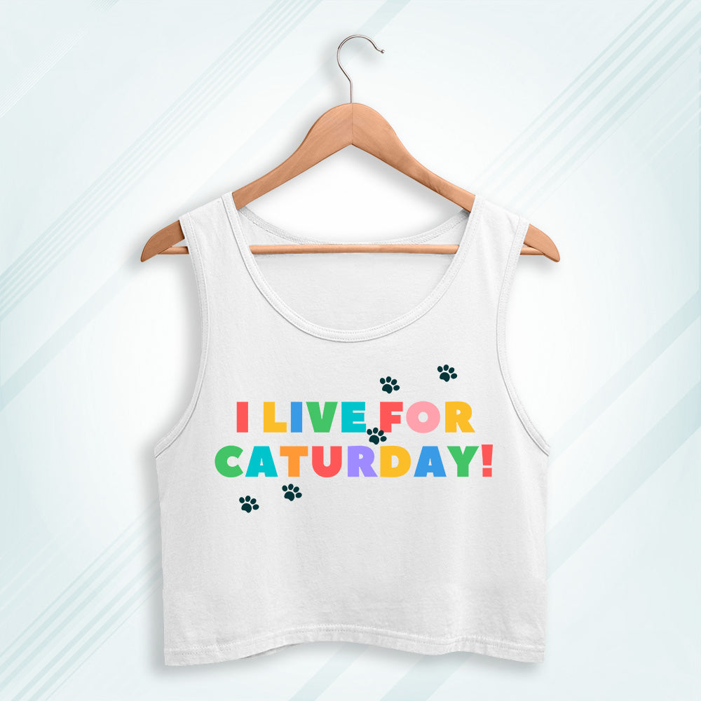 White Cotton I Live For Caturday Printed Sleeveless Crop Tank | Women