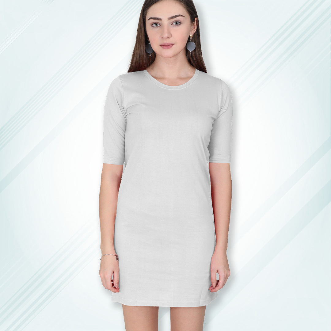 Grey Melange Long T-Shirt Dress | Knee Length 3/4 Quarter Sleeves Cotton Tops with Side Pockets | Women