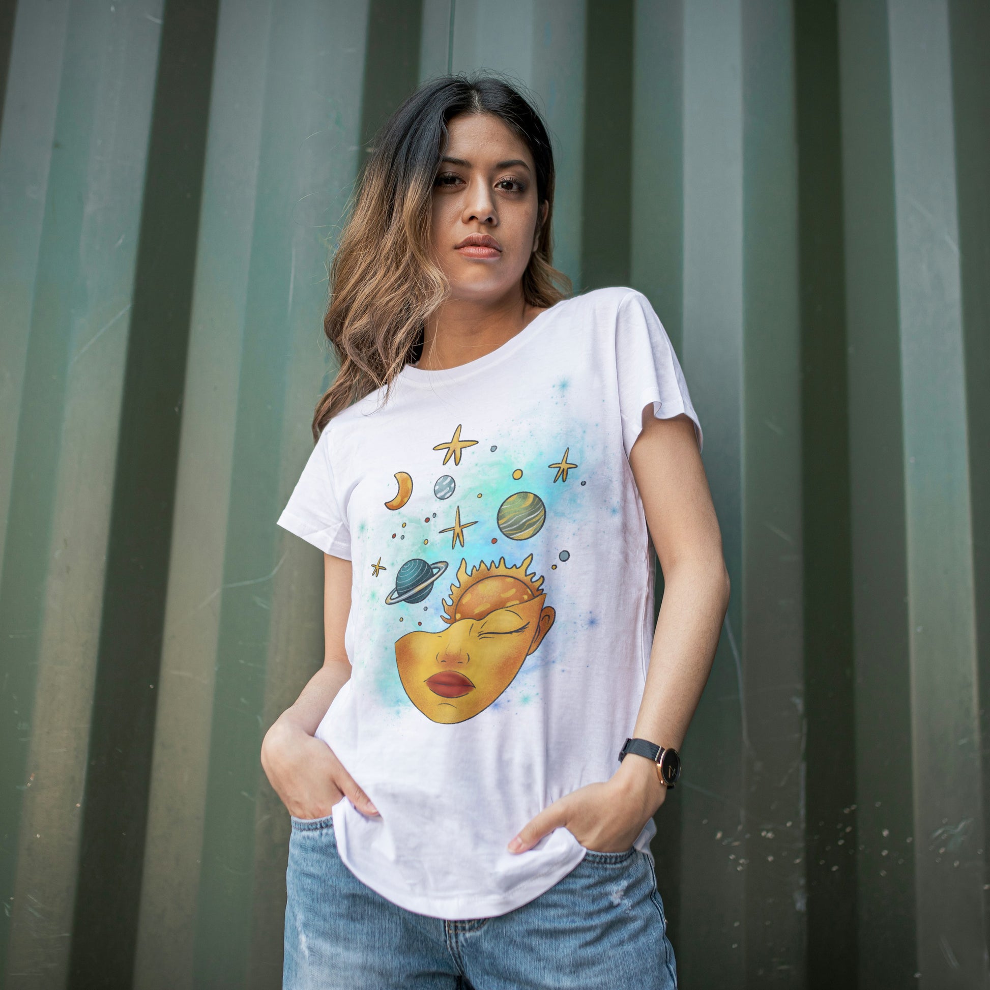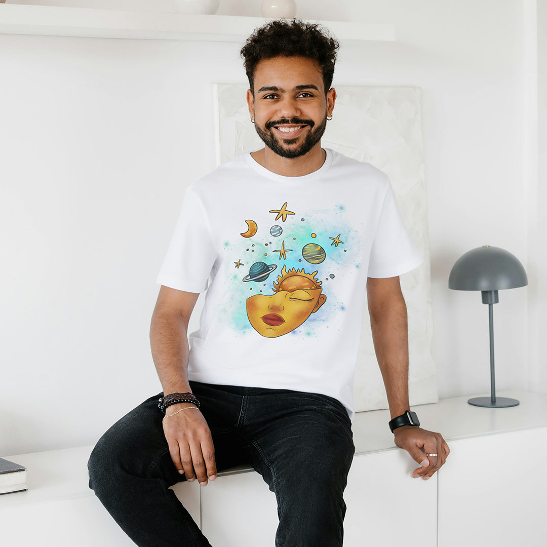 White Round Neck Oversized Cotton Printed T-shirt - Cosmic Serenity