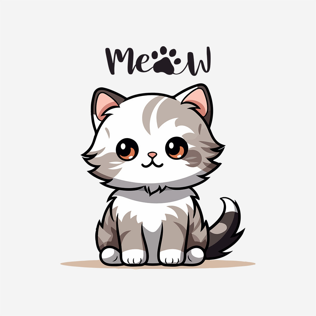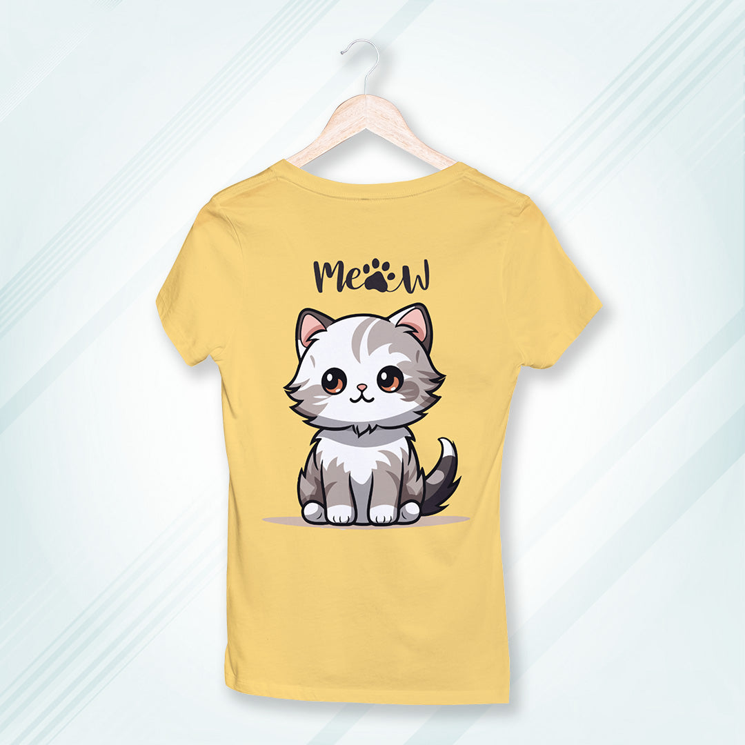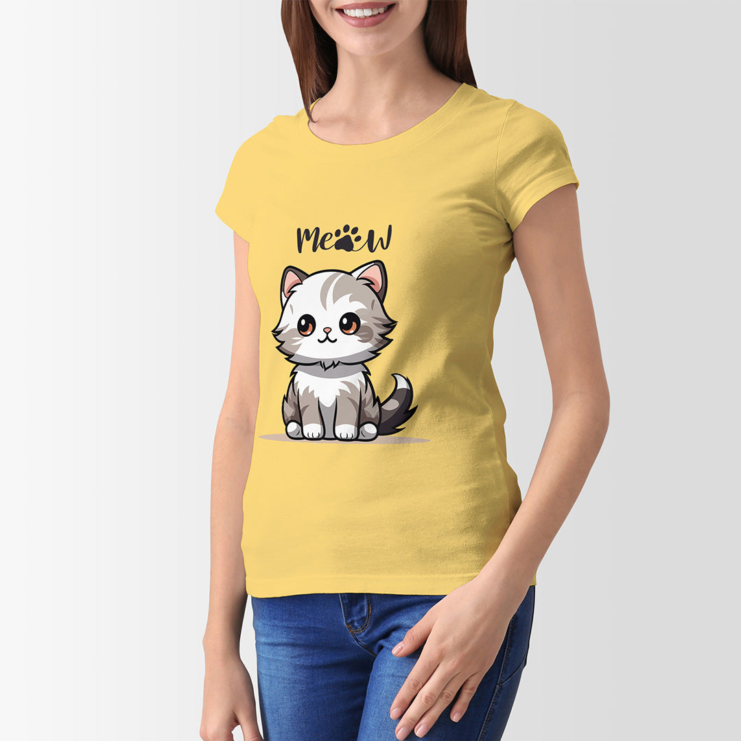Yellow Round Neck Classic Printed Classic T-Shirt Meow Cat | Women